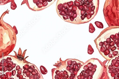 Watercolor illustration frame of exotic fruits such as pomegranate and persimmon with a blank center for writing