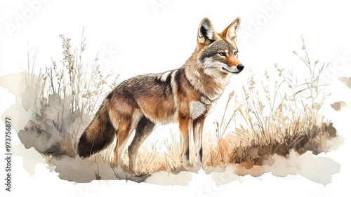 Watercolor illustration of a coyote, with soft hues blending into the natural scenery.