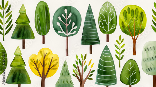 Watercolor illustration of a minimalist Scandinavian pine tree pattern in serene forest green on white ink watercolour