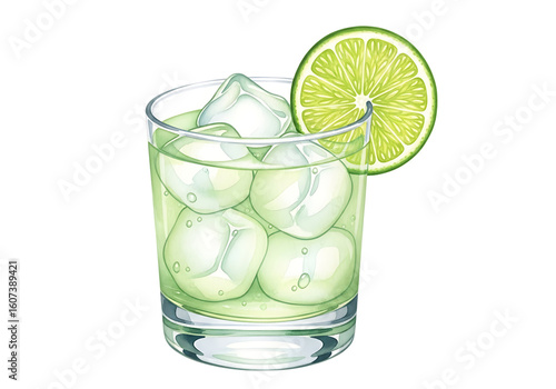 Watercolor illustration of a refreshing lime cocktail with ice cubes in a glass Isolated on Transparent Background