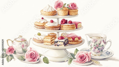 Watercolor illustration of British afternoon tea,tea break in the English style,tea set with Afternoon tea stand with macaroons and scone,cake,cup of tea,Tea time dessert table,vintage style.