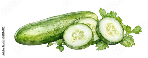 watercolor illustration of Fresh cucumber with slices and cilantro, isolated on a white background.