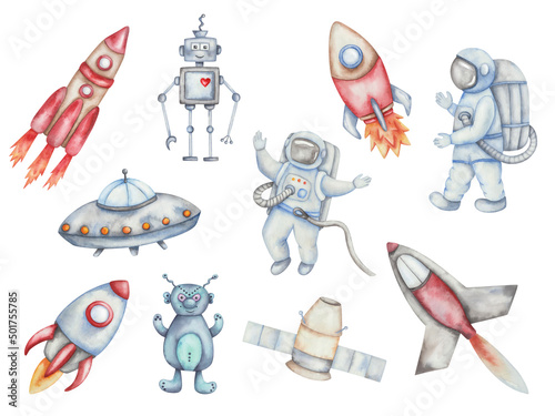 Watercolor illustration of hand painted spaceship, spacecraft, satellite and rocket with fire. Spacemen, alien and robot characters. Isolated clip art vehicles and cosmonaut flying in open space