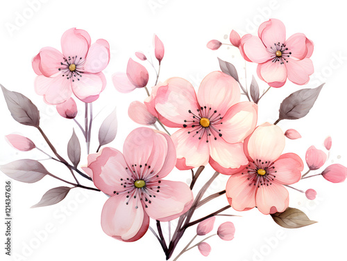 Watercolor illustration of pink blooming spring flowers on white background