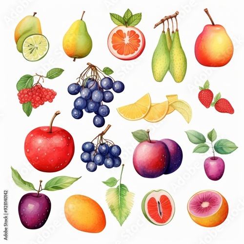 Watercolor illustration of various fruits and berries isolated on a white background.