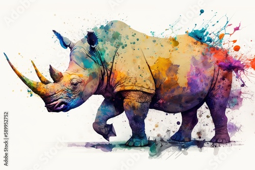 Watercolor of a Rhinoceros in aquarelle style with paint splatters background. Wild Animals paint splatters white background, Generative AI