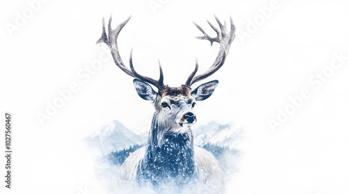 Watercolor painting of a deer, double exposure style with its antlers seamlessly transitioning into a snowy winter landscape, soft whites and cool blues with delicate details, isolated on a white