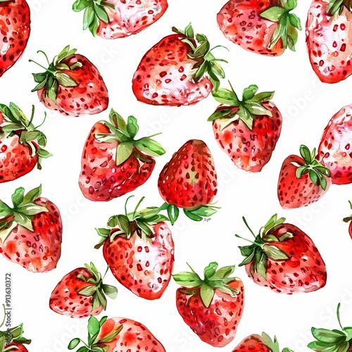 Watercolor painting of a pattern with vibrant strawberries, on isolated white background