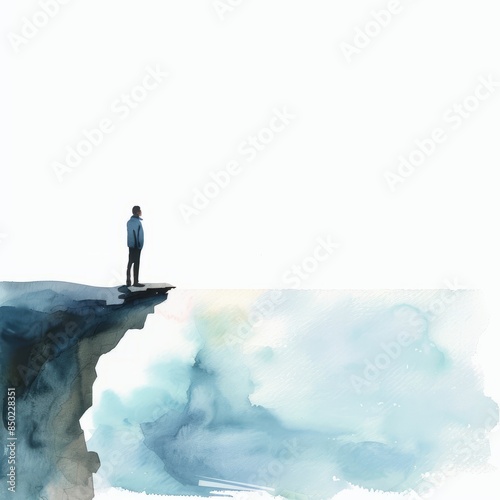 Watercolor painting of a person standing on a cliff edge, staring out at the vast expanse of the ocean, lost in contemplation, on isolated white, Generative AI