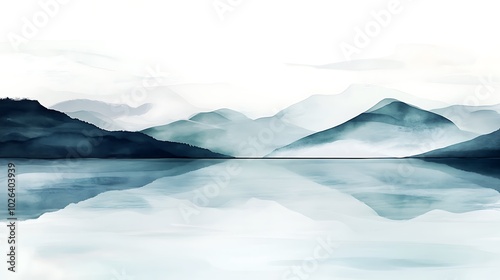 Watercolor painting of a serene lake with mountains in the background. Illustration, Generative AI