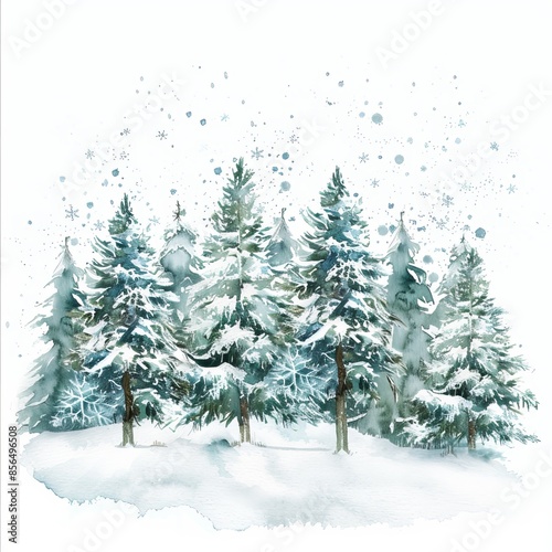 Watercolor painting of a tranquil snowy forest, with soft snowflakes falling and covering pine trees, on isolated white background, Generative AI