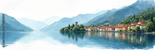 Watercolor painting of Lake Como Italian village. Houses with red tile roofs, green trees. Mountains rise in distance over calm blue water, reflecting clear sky. Tranquil Italian scenery, historic
