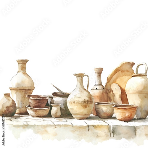 Watercolor Painting of Rustic Pottery on Stone Shelf.