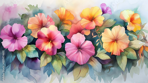 Watercolor painting,Flower Colors bright mix of , pinks, yellows, light blues With light green leaves