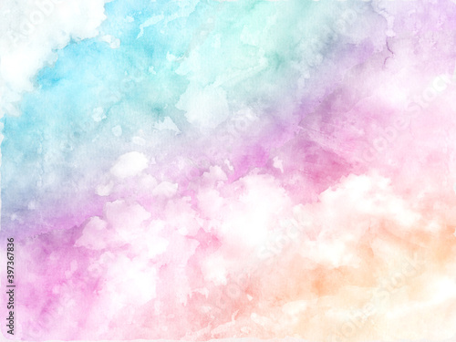 Watercolor pastel background, Colorful drawing on paper, Creative abstract rainbow clouds design