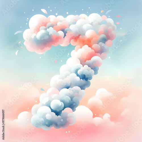 Watercolor pastel colored fluffy clouds forming the number "7" on a pastel background