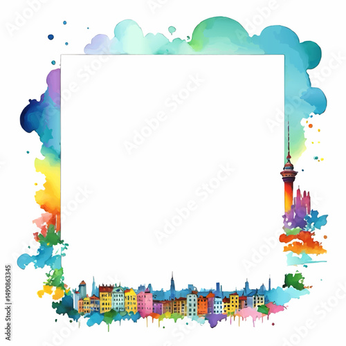 watercolor picture frame pattern with cityscape and bubbles for insertion