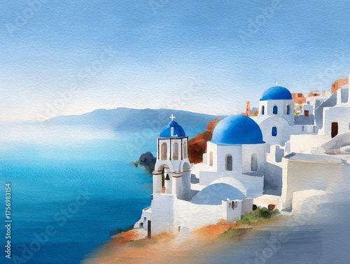 Watercolor scene of santorini cliffside houses greece coastal artwork serene environment aerial view dreamy concept