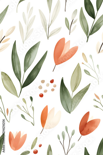 Watercolor seamless pattern of cute minimalistic tulips. Red and green colors isolated on white backdrop