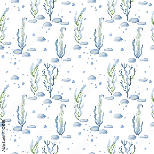 Watercolor seamless pattern with sea plants and stones.