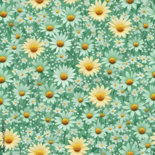 Watercolor seamless pattern with spring daisies. Green texture, for fabrics, textiles, prints, clothes, etc