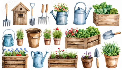 Watercolor set of baskets, watering cans, and rustic home decor.
