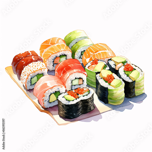 Watercolor style Sushi Assortment, traditional Japanese Cuisine Art with Fresh Seafood Rolls, culinary art
