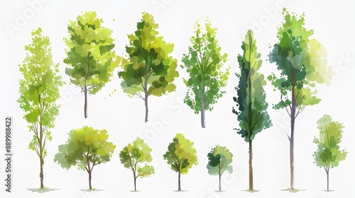 Watercolor Trees Collection of Lush Green Deciduous and Coniferous Trees in Different Shapes and Sizes