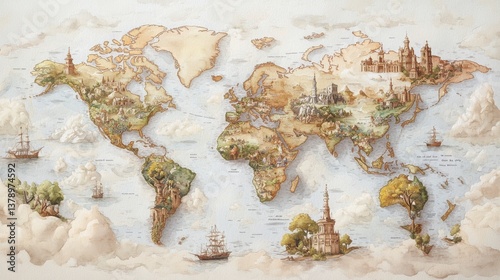 Watercolor World Map Illustration With Vintage Style And Clouds