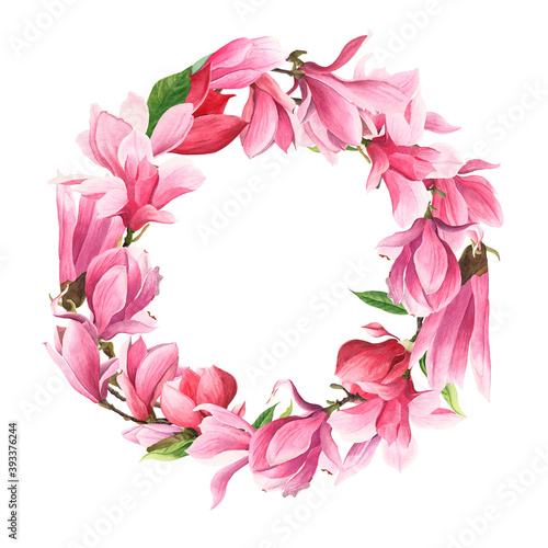 Watercolor wreath of magnolia flowers. Object on a white background.