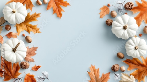 Watercolor-inspired pattern with leaves gently falling onto pumpkins and acorns.