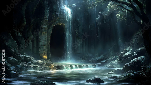 Waterfall Cascades into Ancient Ruins, Mystical Forest Setting