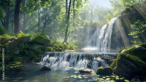 Waterfall Cascading Through Forest Sunlight Creates Peaceful Scenic Landscape