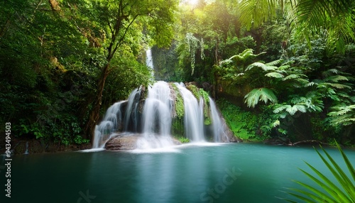 waterfall in forest waterfall in the jungle tropical landscape in the jungle plants and green trees in the jungle waterfall with lake in the forest