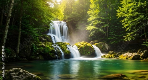 Waterfall in Lush Forest: A mesmerizing waterfall cascading through a dense, verdant forest, creating a serene and idyllic scene of natural beauty.