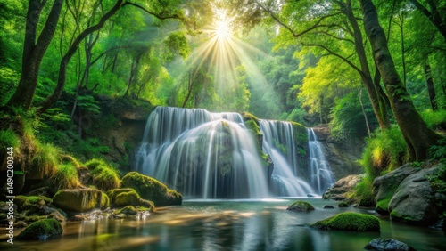 waterfall in lush green forest surrounded by trees and rocks, with sunlight filtering through the leaves, foliage, scenery