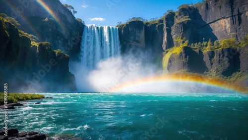Waterfall Splashing into Turquoise River with Rainbows Against Rocky Cliffs