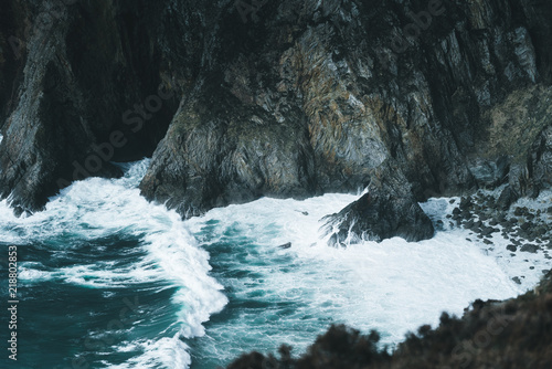 Waves crashing against cliff