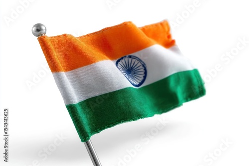 Waving Indian flag on a stick with orange white and green stripes and a blue wheel in the center