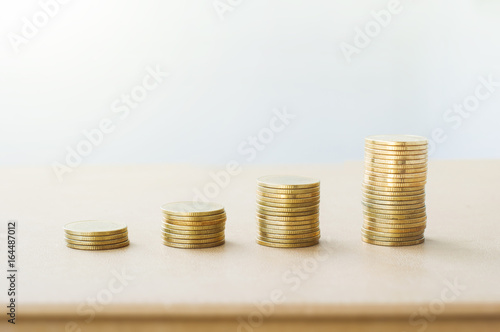Wealth growing money rows of coins growth up on the table with white background in business finance and banking concept