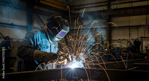 wearing a protective mask and gloves, carefully works on a glowing metal piece, set against a detailed industrial workshop background filled with machinery and tools, capturing the intensity and.