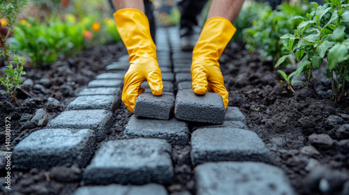 Wearing yellow gloves, a paving expert methodically arranges concrete tiles to build a garden walkway