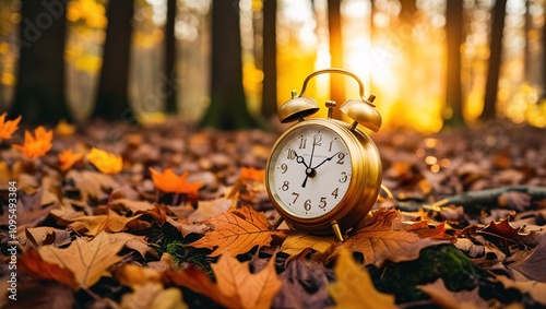 Weather Change, changeover, switch of time. Sommer or winter time. Clock as a timer for Time Up. Autumnal forest and leaves.