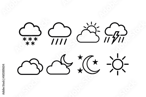 Weather Forecast Icons Representing Snow, Rain, Sunshine, Storm, Clouds, Crescent Moon, and Stars in a Clean and Simple Style