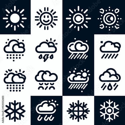 Weather icons including sun, clouds, rain, snow, and storms in black and white design