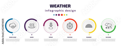 weather infographic element with icons and 6 step or option. weather icons such as snow cloud, warm, spring, freezing, rainbow, blizzard vector. can be used for banner, info graph, web,