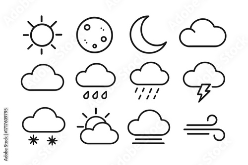 Weather line icon set. Meteorology forecast symbols. Vector collection of outline pictograms: sun, moon, cloud, rain, snow, wind, storm, thunder, fog, climate. For web, app.