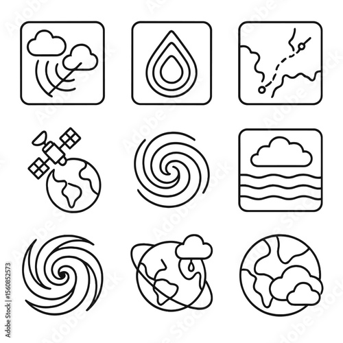 Weather Satellite Icons. Outline style icons of Satellite Weather View: cloud radar map, heat map symbol, storm path tracking,
