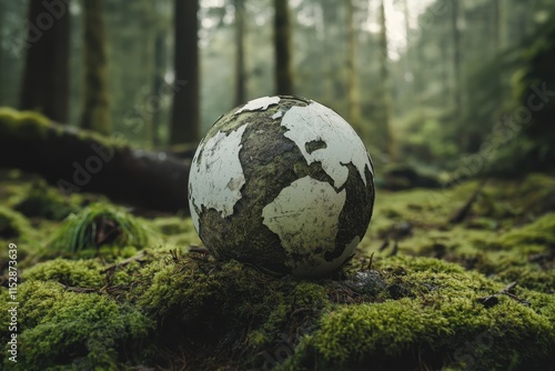 Weathered globe rests on mossy forest floor.