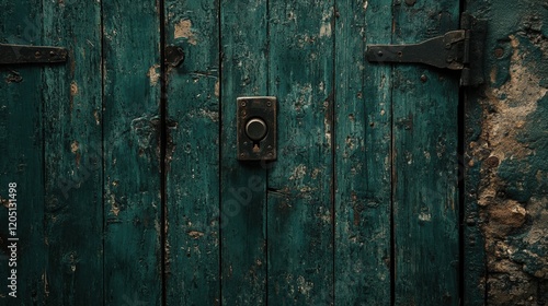 Weathered Green Wooden Door with Rustic Hardware and Texture